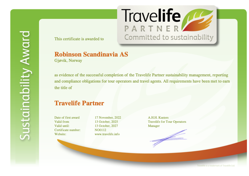 Tourism is one of the fastest growing industries as people all around the world love travelling, and find joy in exploring nature, meeting people and gaining new knowledge of foreign cultures. We are aware that if we do not act carefully, these actions can put pressure on our climate and eco-system. Robinson Scandinavia AS aims to act responsibly by avoiding or minimising the negative impact, and contribute to a more sustainable tourism. Our mission is to grow our business in a sustainable way by adapting our travel policies. We will also support our partners towards higher sustainability standards, and more sustainable travel behaviour.